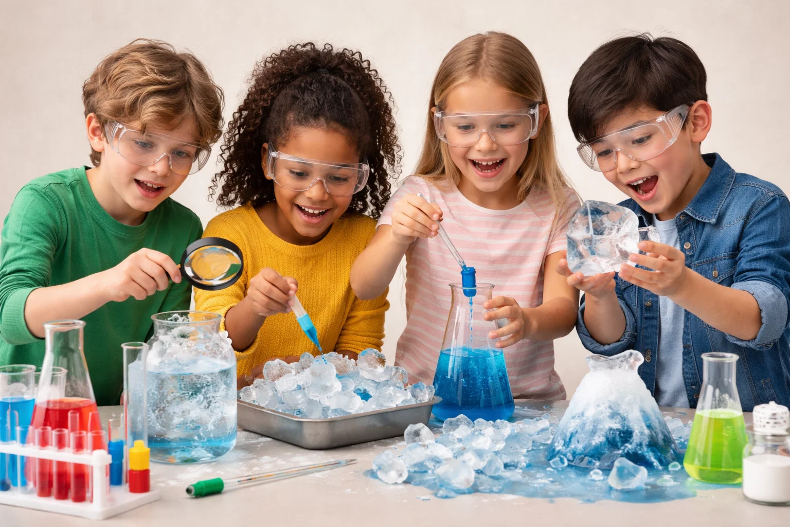 Entdeckt die faszinierende Welt des Wassers und werdet zum Eis-Experten! Habt Ihr Euch mal gefragt, warum Eisberge schwimmen und warum sind sie so gefährlich für die Schifffahrt sind? Warum platzen Getränke in Glasflaschen, wenn sie gefrieren? Und warum werden Straßen im Winter mit Salz gestreut? Diese und andere Fragen rund um Wasser im festen und flüssigen Aggregatzustand können SchülerInnen bei uns in verschiedenen Experimenten erforschen.